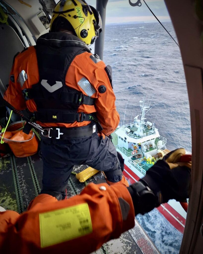Þyrlusveit Landhelgisgæslunnar var kölluð út til að flytja manninn á sjúkrahús í Reykjavík. Þegar þyrlusveitin kom á staðinn var talsverð hreyfing á skipinu og allhvöss austanátt. Sigmaður þyrlunnar fór um borð í skipið og undirbjó skipverjann sem var hífður í þyrluna. Að því búnu flaug þyrlan með manninn á Reykjavíkurflugvöll þar sem sjúkrabíll beið og flutti hann á Landspítalann.