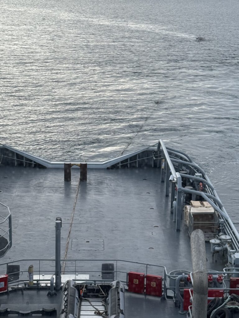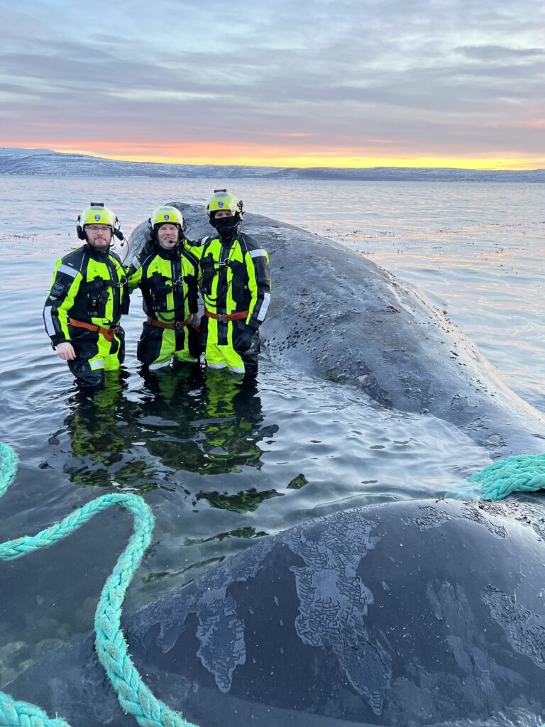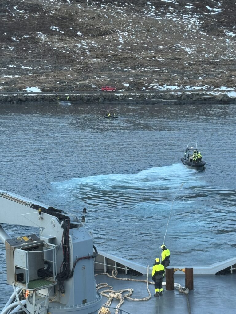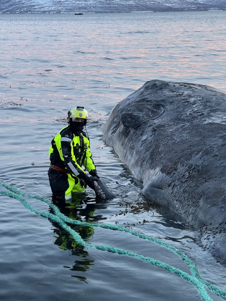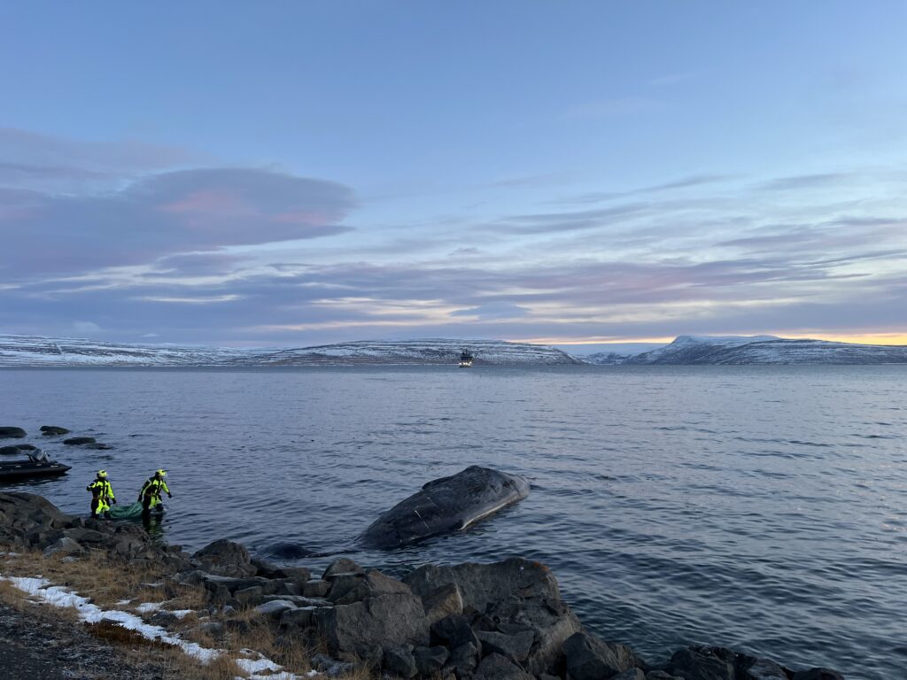 Búrhvalurinn var dreginn um 25 sjómílur vestur af Straumnesi þar sem honum var sleppt utan við sjávarfallastrauma. Meðfylgjandi myndir sýna frá aðgerðum áhafnarinnar sem heppnuðust afar vel.