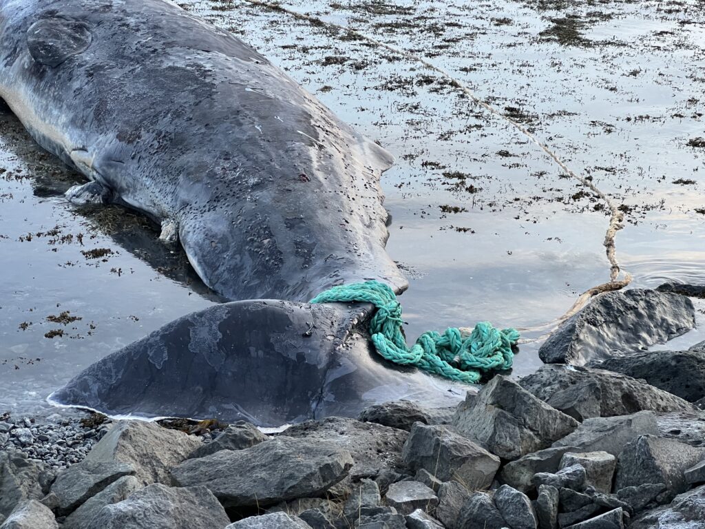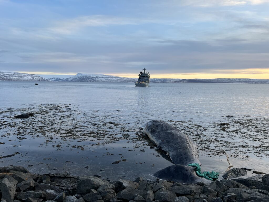 Taugar voru settar í sporð búrhvalsins og að því búnu var hræið dregið á haf út.