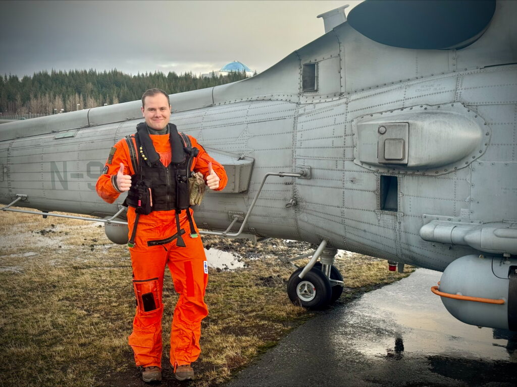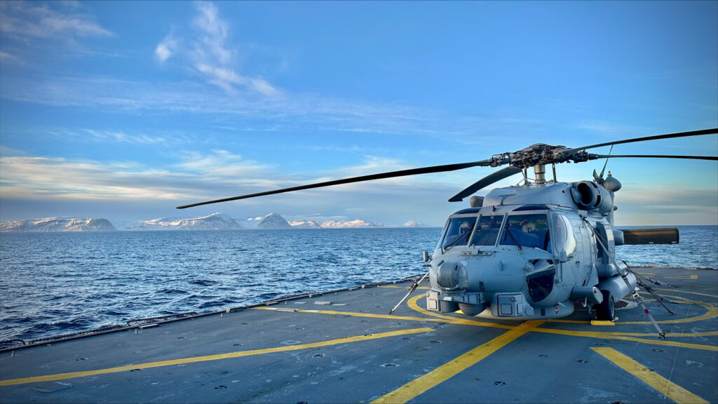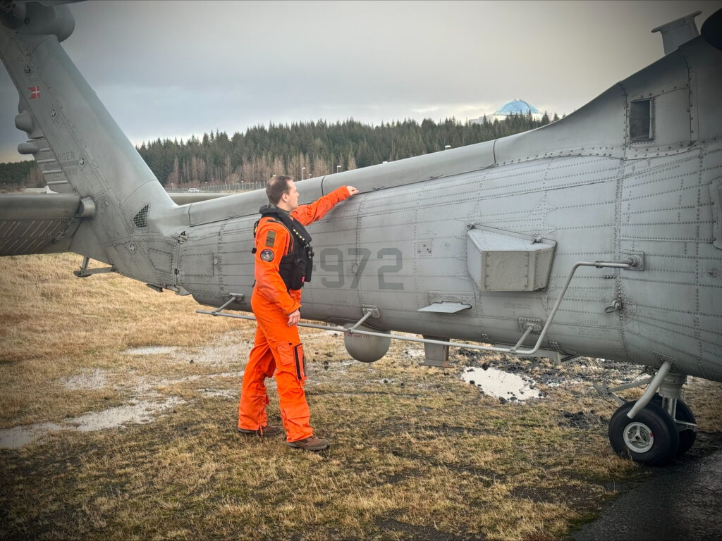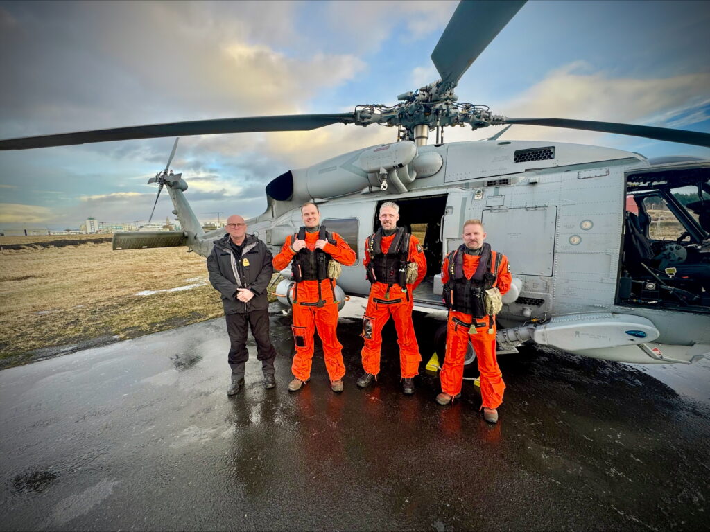 Georg Kr. Lárusson, forstjóri Landhelgisgæslu Íslands, heilsaði upp á áhöfn á þyrlu danska varðskipsins Thetis í stuttri viðdvöl hennar á Reykjavíkurflugvelli á dögunum. Áhöfn dönsku þyrlunnar nýtti sér aðstöðu Landhelgisgæslunnar á flugvellinum áður en þyrlunni var lent aftur á skipinu. Líkt og greint var frá í síðustu viku æfði áhöfnin á Freyju með áhöfn Thetis úti fyrir Seyðisfirði fyrr í mánuðinum.