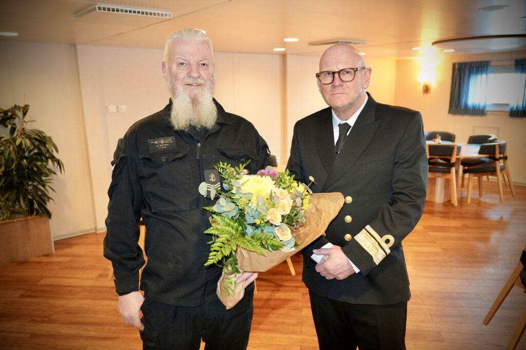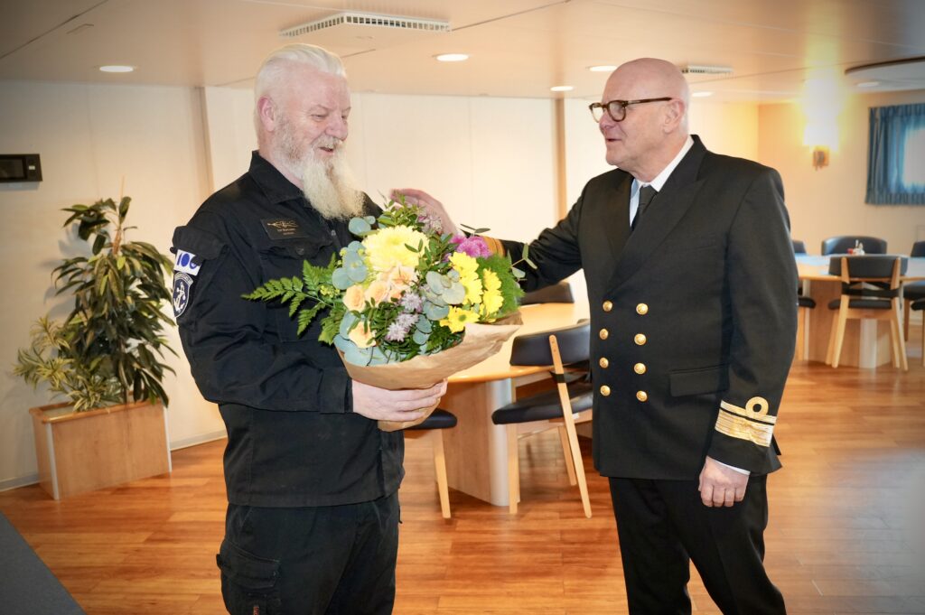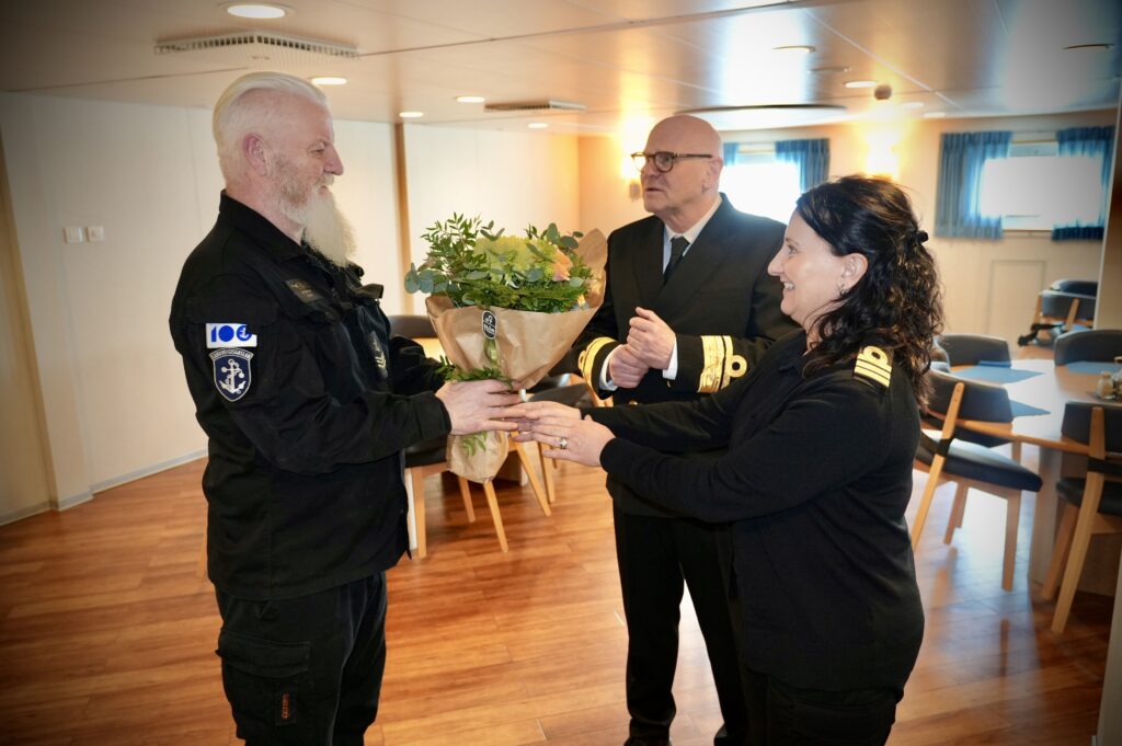 Georg Kr. Lárusson tók á móti Jarli þegar skipið kom í land og Svanhildur Sverrisdóttir, mannauðsstjóri Landhelgisgæslunnar, færði honum blómvönd í tilefni tímamótanna.